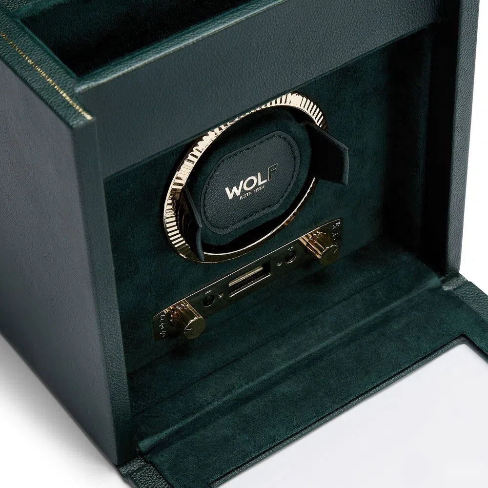 Eleganza e precisione si fondono nel Remontoir Montre British Racing 1 Montre di Wolf, un accessorio senza compromessi. Questo avvolgitore si distingue per il suo stile unico, che combina pelle vegana verde e accessori dorati, aggiungendo un tocco di raffinatezza alla vostra collezione di orologi.