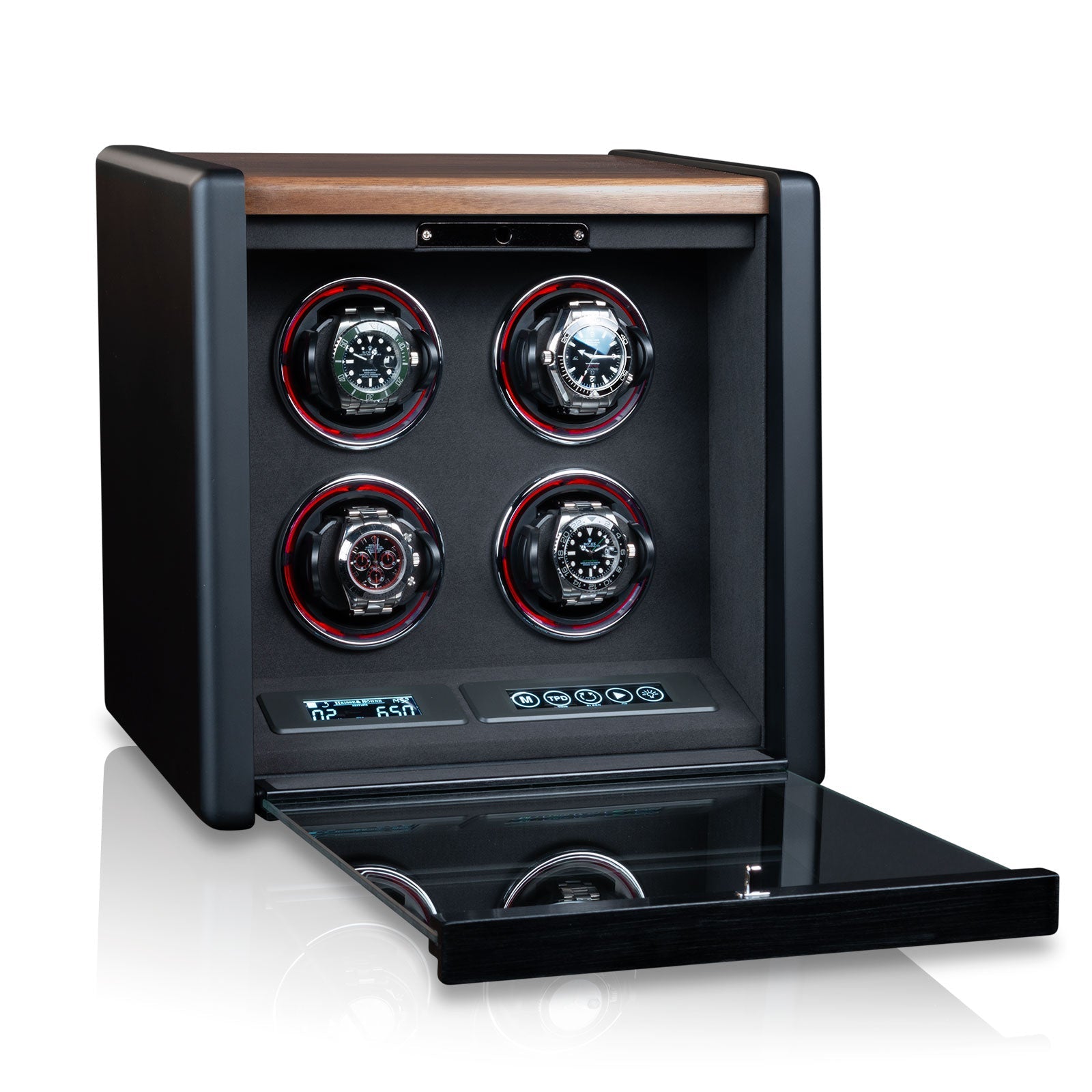 All'interno, i supporti per orologi foderati in velluto offrono un alloggiamento morbido e sicuro per le montre automatiche, regolabili su un'ampia gamma di dimensioni di polso. La tecnologia H&S Premium-Drive assicura un arrotolamento morbido, silenzioso e duraturo degli orologi, mentre l'H&S LCD-Control permette una programmazione intuitiva e personalizzata della direzione e del numero di rotazioni al giorno. Le funzioni aggiuntive H&S Perfect-Stop 12 e H&S Smart Sleep garantiscono un riposo notturno silenzioso e una riduzione della tensione nel meccanismo di carica degli orologi.