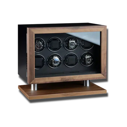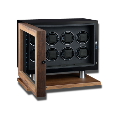 Carica Orologi - New York 8 Nero è il perfetto equilibrio tra lusso e funzionalità. Realizzato con cura in legno di quercia rifinito con un velluto raffinato, questo caricaorologi rappresenta il massimo in termini di eleganza discreta e affidabilità tecnica. Ideale per fino a otto orologi, è progettato per mantenere senza sforzo il corretto funzionamento dei vostri preziosi segnatempo grazie alla sua capacità di rotazione regolabile per ogni orologio.
