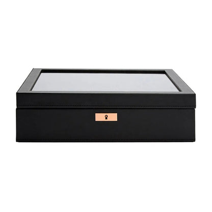 Realizzata dall'illustre marca Wolf, questa scatola offre un ampio spazio interno, con una lunghezza di 32,7 cm, larghezza di 32,39 cm e altezza di 9,53 cm. È ideale per esporre i vostri orologi con stile mentre li mantenete in ordine. La pelle vegana che la compone aumenta la sua raffinatezza e durata.