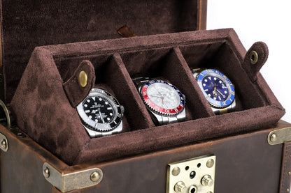 Il Porta orologi - Scrigno Tesoro Trio è la soluzione ideale per conservare e proteggere i tuoi orologi automatici con stile ed eleganza. Con una capacità di stoccaggio per tre orologi, questo cofanetto unico richiama il fascino dei tesori pirateschi e offre un ambiente sicuro e protetto per gli orologi più pregiati.